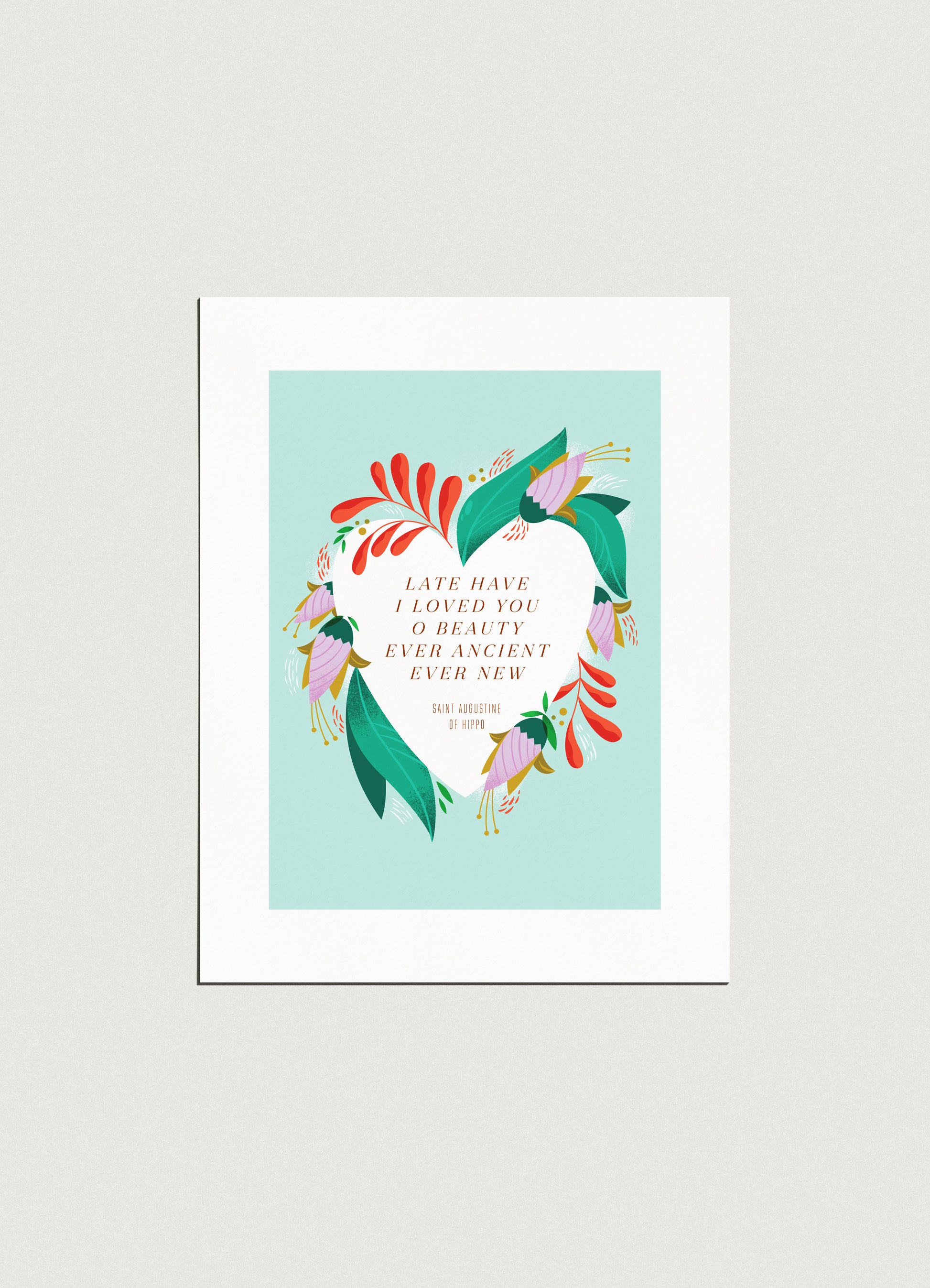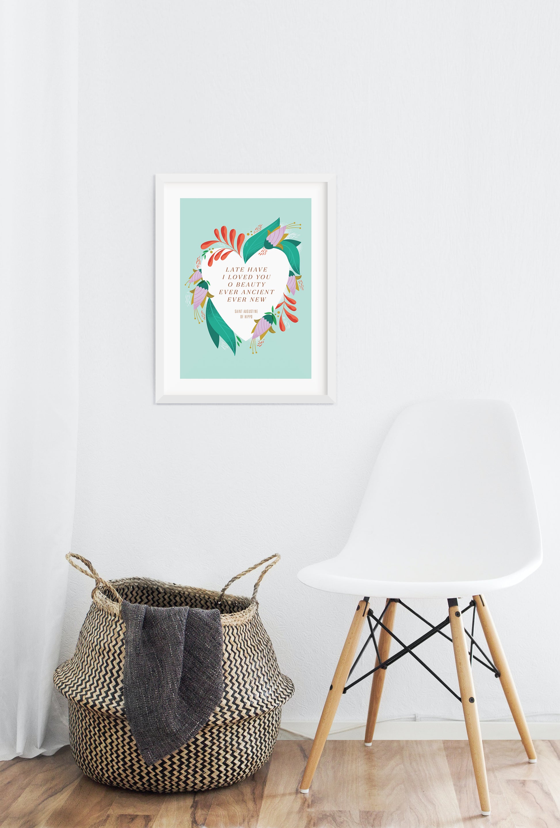 St. Augustine of Hippo is likely one of your fave saints, right? His eloquence enlivens your space with this print. Illustrated with soft greens and made bold with contrasting brights, this print brings beauty and meaning wherever you may decide to hang it.