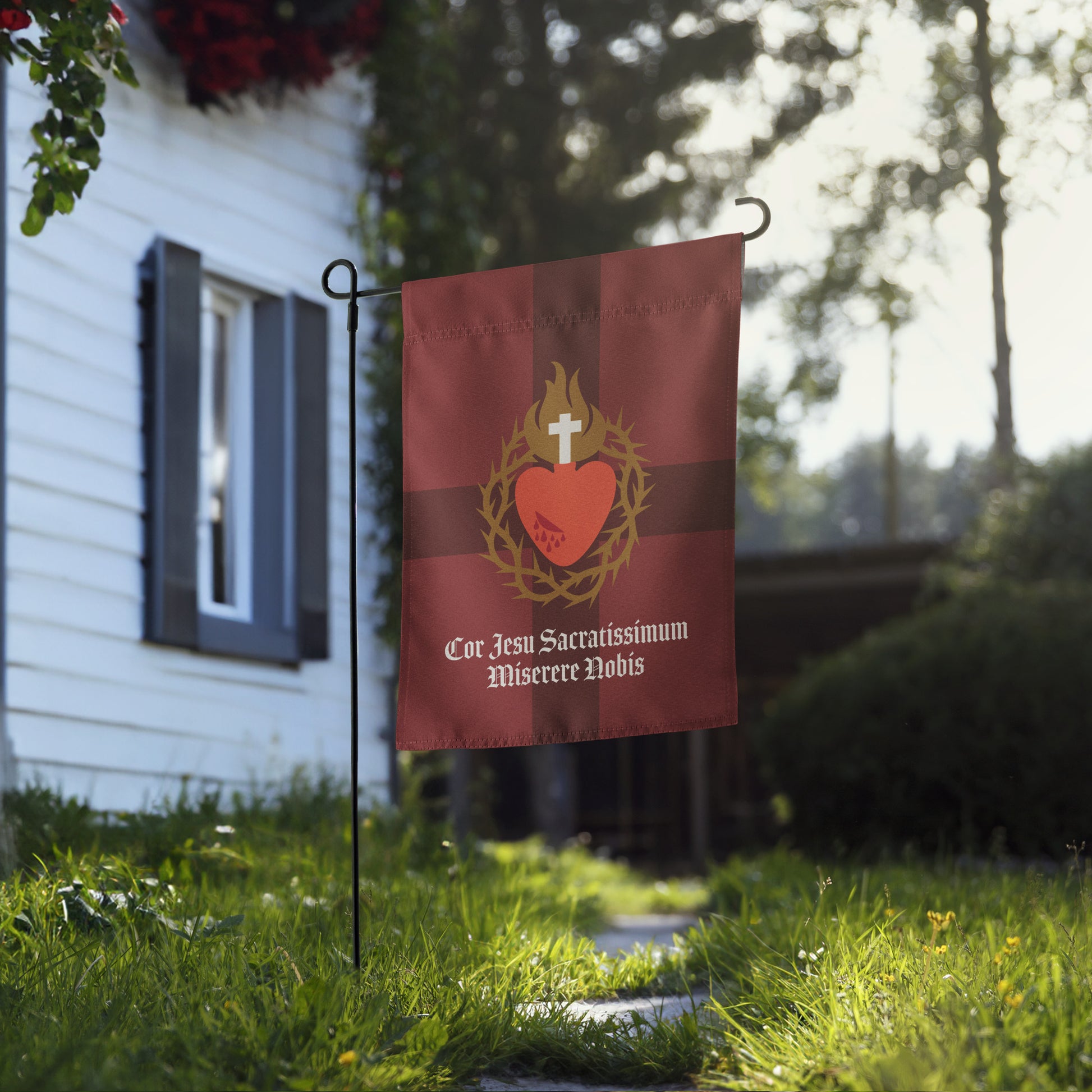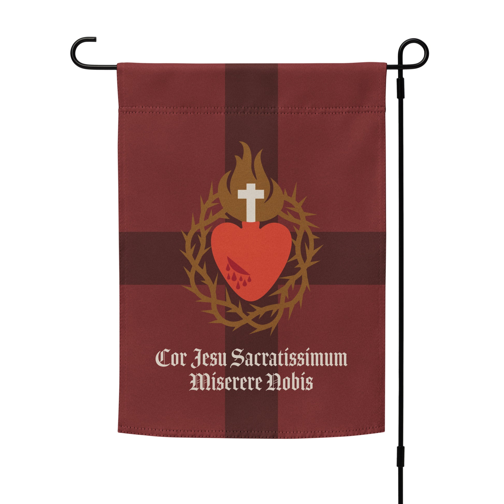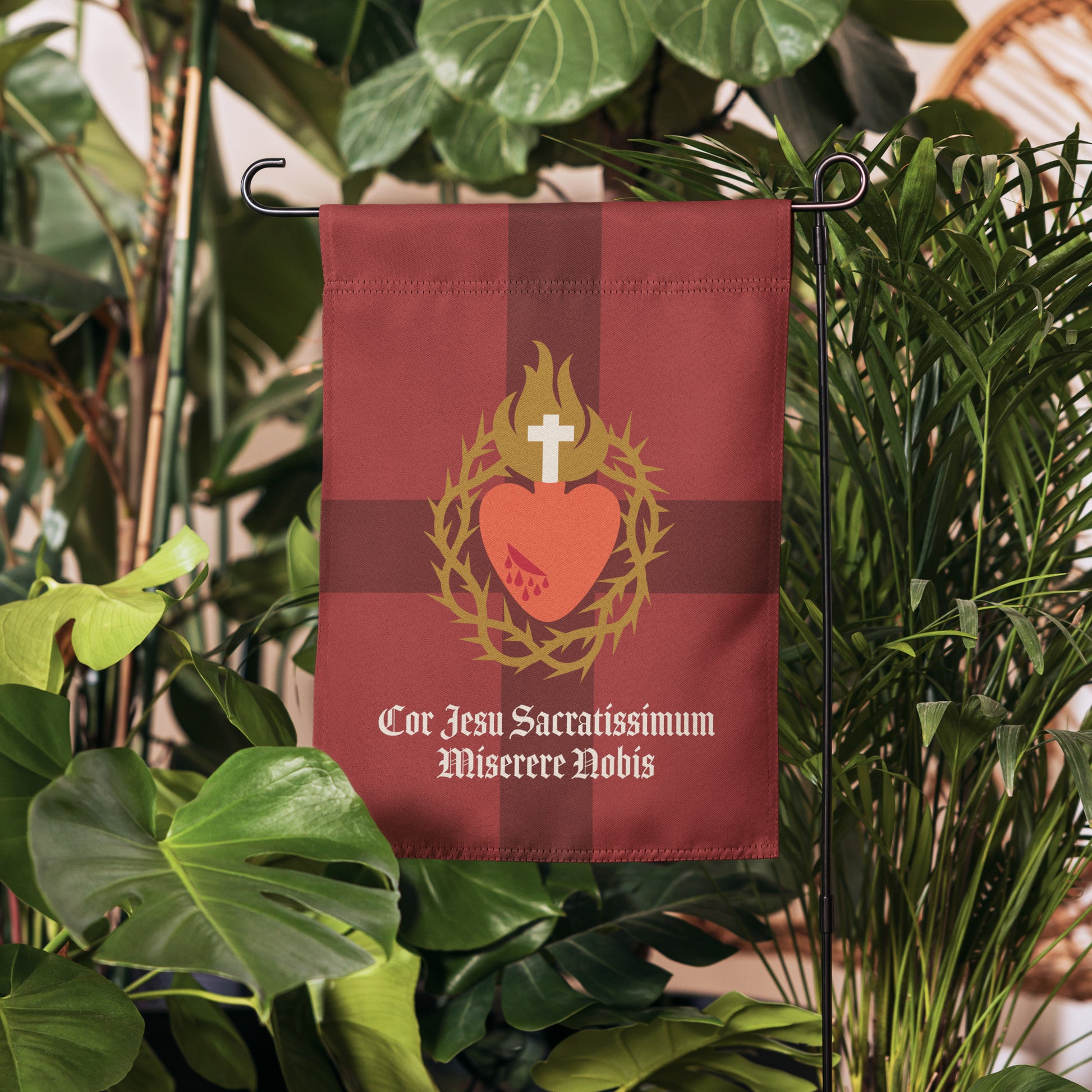 Express your love and devotion to the Sacred Heart of Jesus with this lovely garden flag. A Sacred Heart icon is featured on the front and a pattern on the back. "Cor Jesu Sacratissimum Misere Nobis" is printed on the front, which is Latin for "Sacred Heart of Jesus Have Mercy on Us."