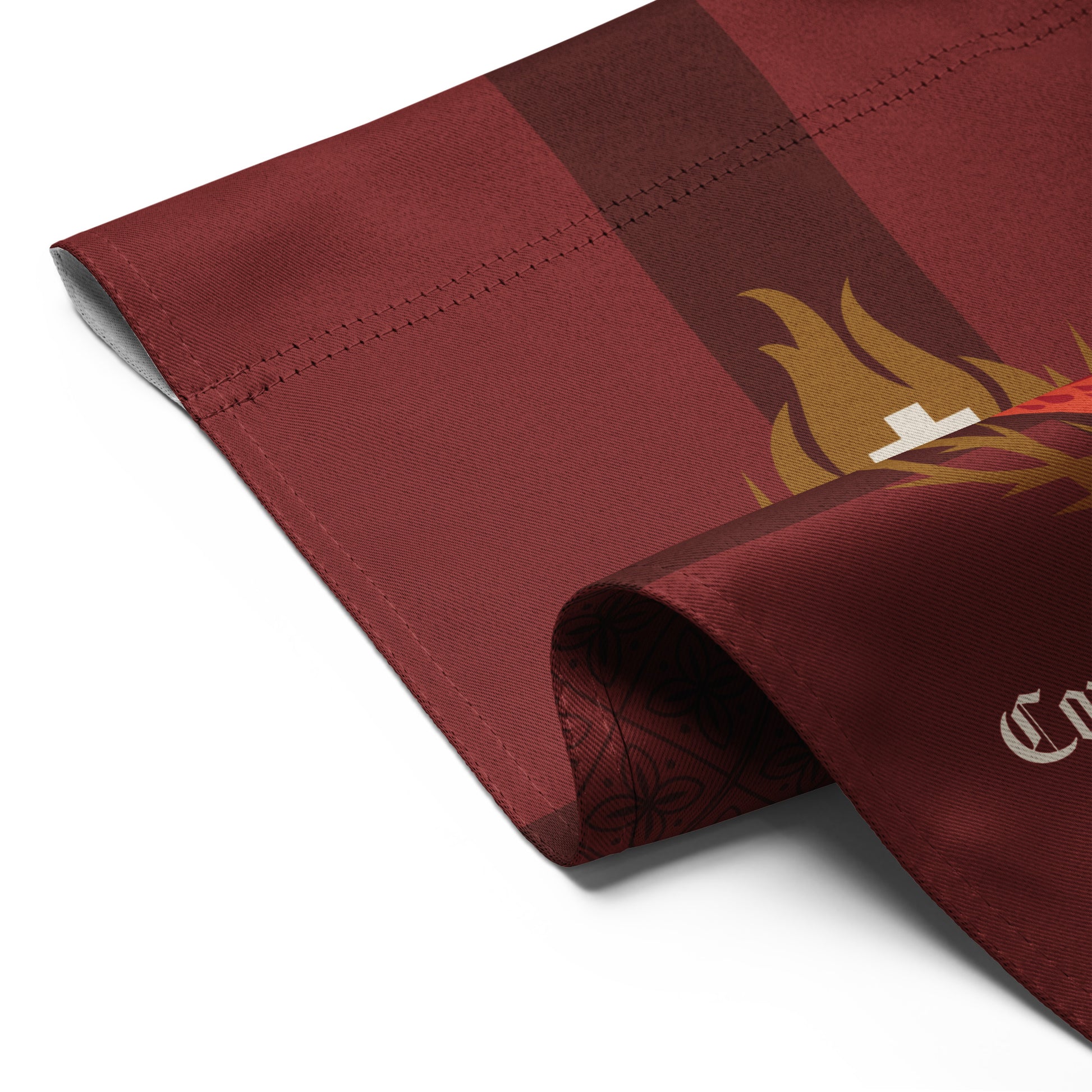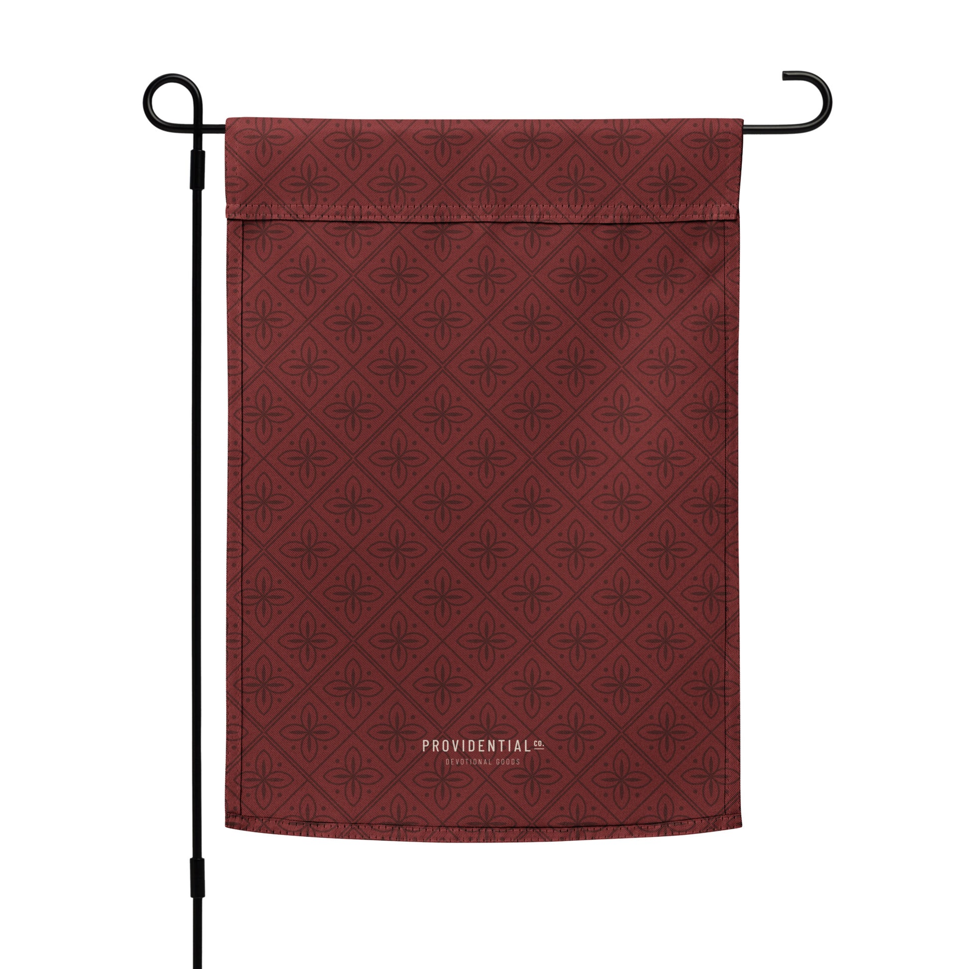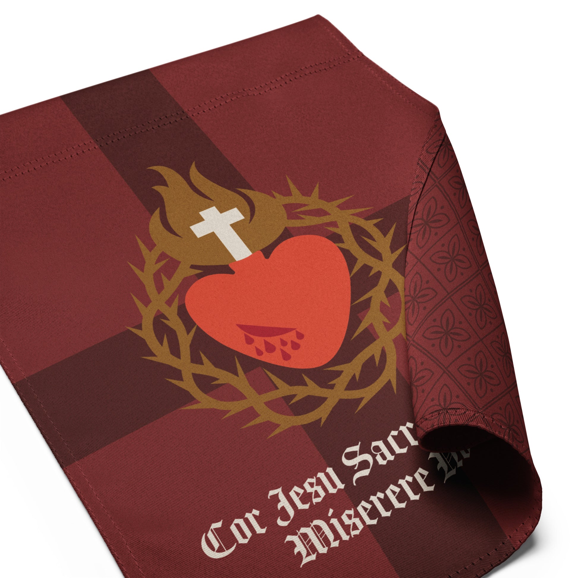 Express your love and devotion to the Sacred Heart of Jesus with this lovely garden flag. A Sacred Heart icon is featured on the front and a pattern on the back. "Cor Jesu Sacratissimum Misere Nobis" is printed on the front, which is Latin for "Sacred Heart of Jesus Have Mercy on Us."